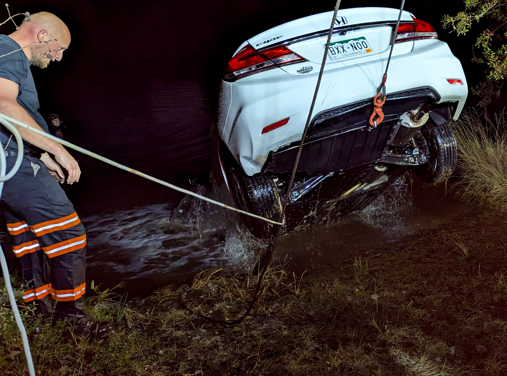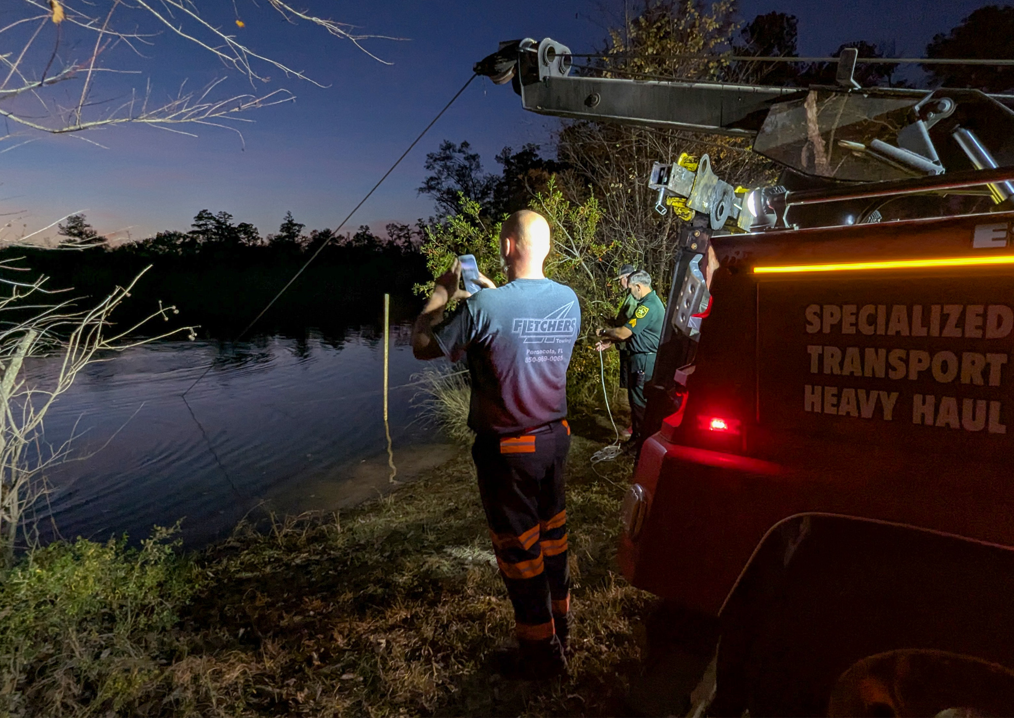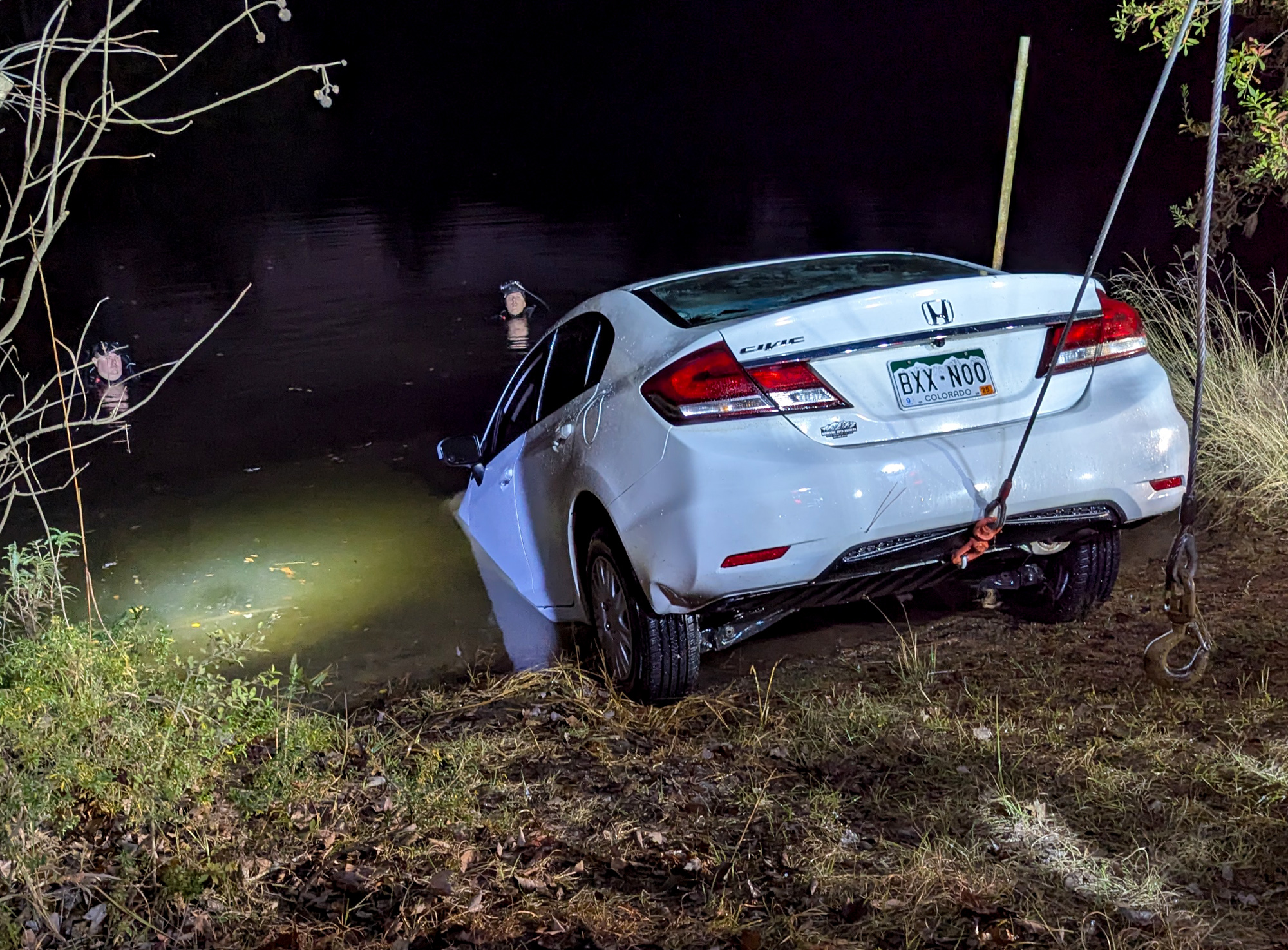 The Sheriff’s Office dive team assisted a wrecker company in hooking to the sedan. The vehicle was slowly winched to the shore, where it was confirmed that no one was inside.