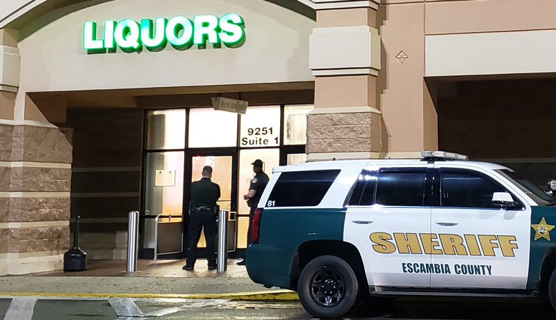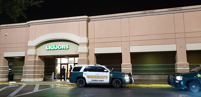 Pictured top and bottom: The Public Liquor store at University Town Center was robbed Thursday night. Pictured first below: Deputies search the area for a suspect. NorthEscambia.com photos by Kristi Barbour, click to enlarge.