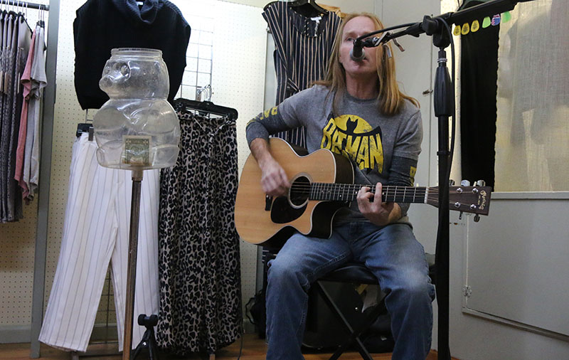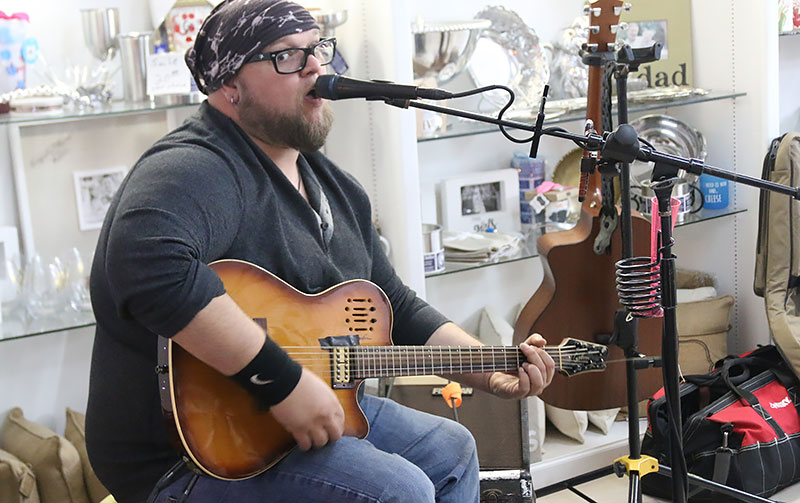 Residents from across the area attended “Music on Main” in downtown Atmore Thursday evening. The event featured musical artists performing inside businesses in the downtown district. Pictured top: Lacey Garner performs at The Yellow Garden. Below: Justin Wall at Your Little Pink Boutique and Chris Hergenroder at Carl’s/Tot Shop. NorthEscambia.com photos, click to enlarge.