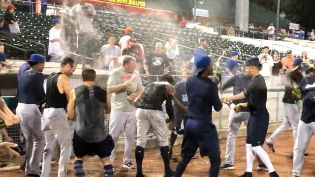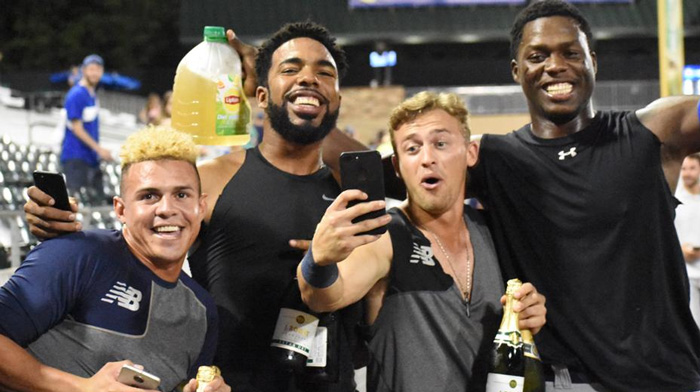 Pictured: The Pensacola Blue Wahoos celebrate in Kodak, TN, after clinching a playoff berth. Photos for NorthEscambia.com, click to enlarge.