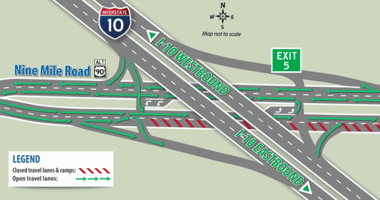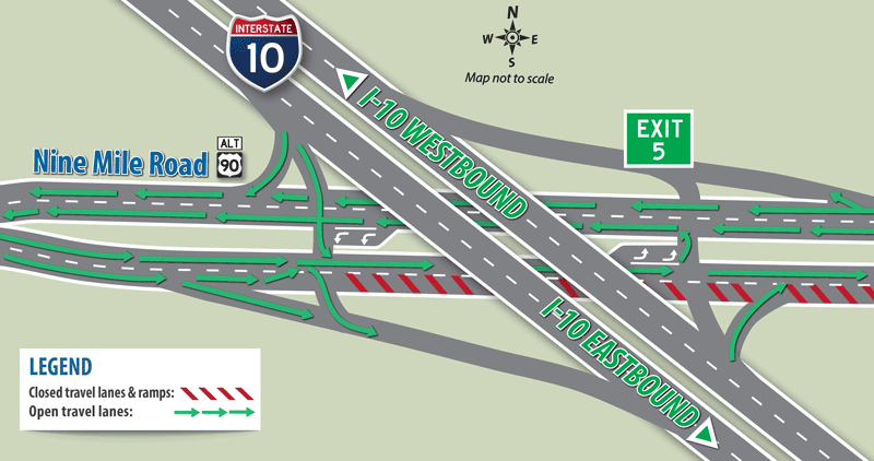 The eastbound, outside lane on Nine Mile Road will be closed for approximately one-half-mile on either side of the I-10 overpass beginning the week of Monday, July 23 as crews construct overpass column improvements. There are no impacts to the I-10 on-and-off ramp configuration at this time. The lane restriction is expected to remain in place until work is complete.
