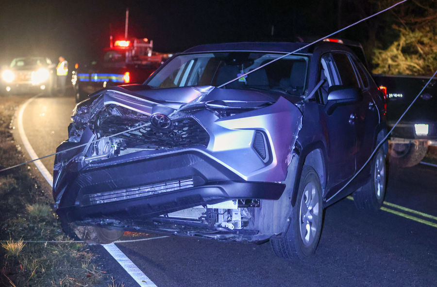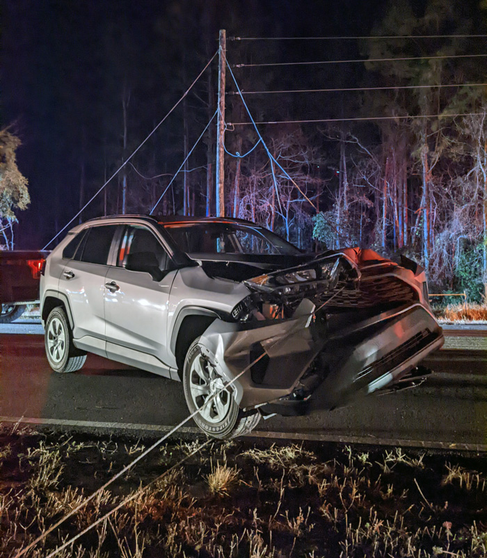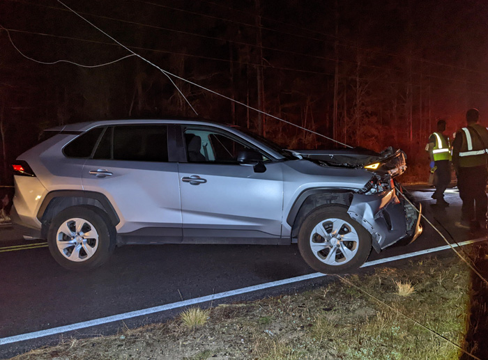 The utility pole pulled guy wires down across Pine Barren Road, about three-quarters of mile north of Breastworks Road. The driver of a Toyota RAV4 later collided with the downed wires.