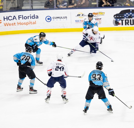 The night opened with immediate intensity as Pensacola’s Laudon Poellinger and Quad City’s Nick Pennucci dropped the gloves in a spirited center-ice scrum that brought the crowd to its feet. Both players exchanged a flurry of blows in an emotional opening sequence, setting the tone for a physical matchup. Despite the early fireworks and several quality chances on both ends, the first period remained scoreless.