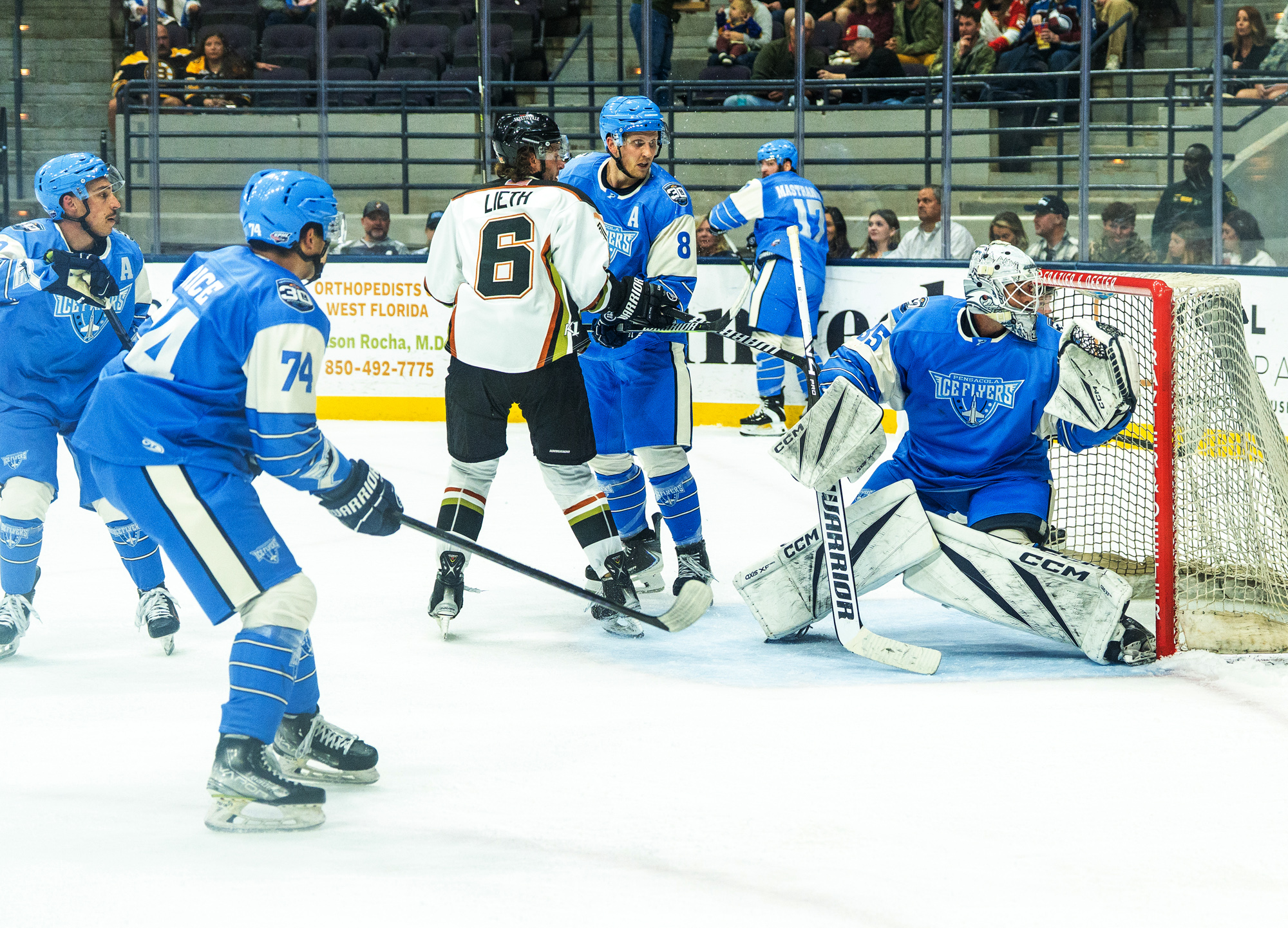 After a scoreless first period that saw both teams trade chances, Sam Rhodes broke through in the second to give the Ice Flyers a 1-0 lead. Tim Kent evened the score for Fayetteville midway through the frame, but Rhodes answered back late in the period to restore the Ice Flyers’ advantage. Tyler Burnie added another goal before the end of the second, sending Pensacola into the final period with a commanding 3-1 lead.