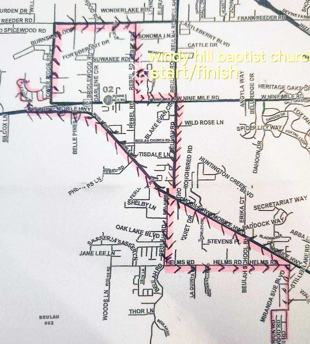 The annual Beulah Christmas Parade will be Saturday, December 6 at 1 p.m. The parade will begin at Windy Hill Baptist Church on Rebel Road. It will then travel south on Rebel Road, to West Nine Mile Road, to Beulah Road, to Helms Road, to Mobile Highway, continuing through Vintage Creek, Tower Ridge, and Frank Reeder, and then return to Windy Hill Baptist on Rebel Road. For a map provided by organizers, click here. To enter the parade, click here to download the application. Return the completed form to the address or email provided at the top.