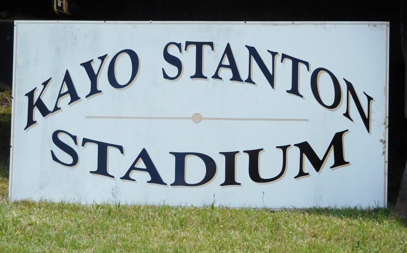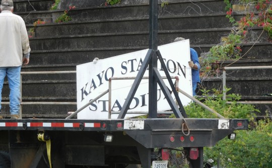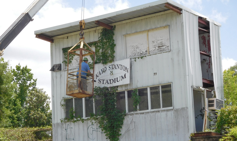 On Thursday, crews used a crane to remove the “Kayo Stanton Stadium” sign from outside the press box and transported it to the Alger-Sullivan Historical Park where it will be put on display.
