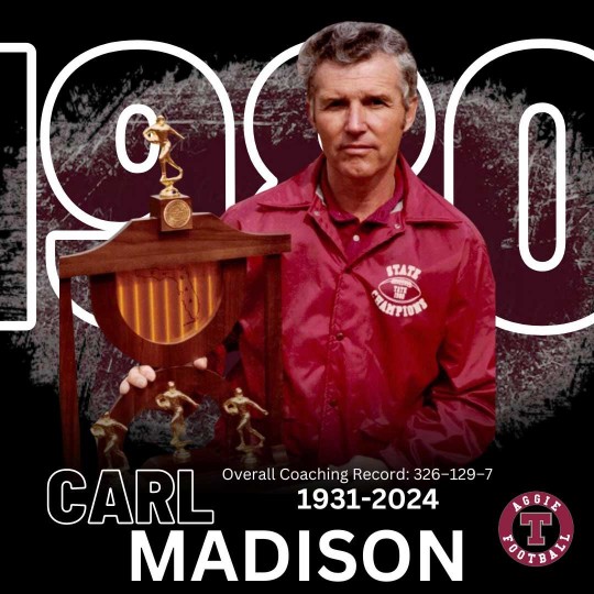 Madison was surrounded at the ceremony by former players from his nearly five decades coaching, including members of the Aggies 1980 state championship team.