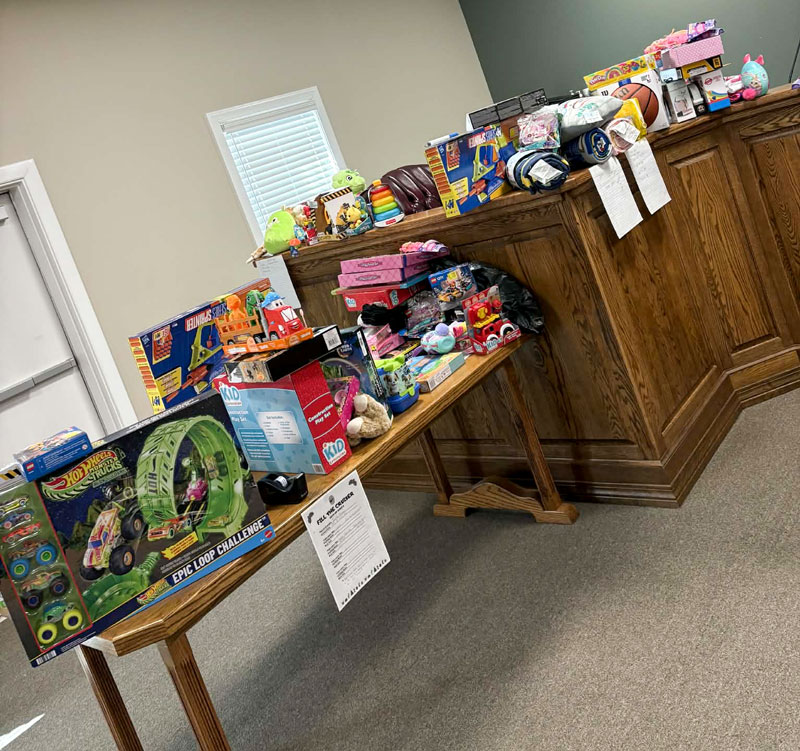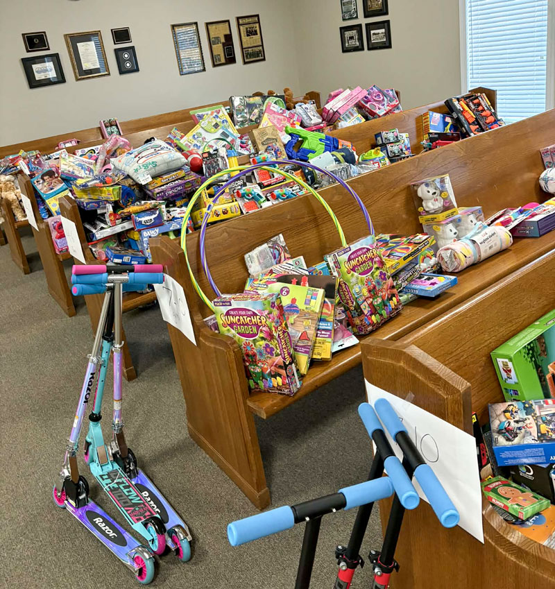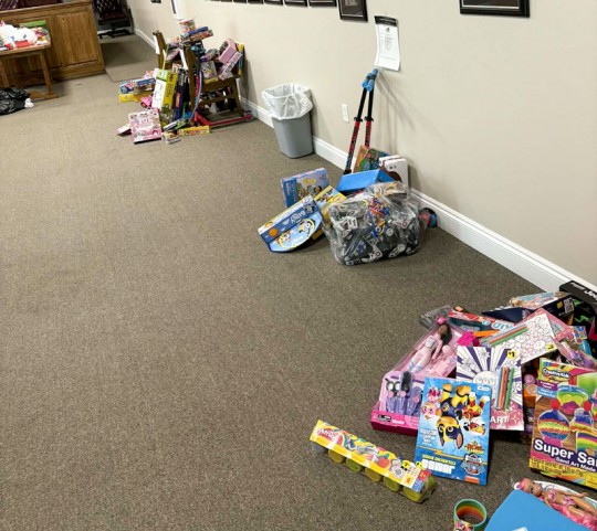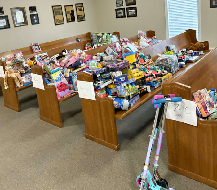 With donations from area businesses, a Scout troop and other local organizations, the gifts filled the town council chamber prior to distribution.