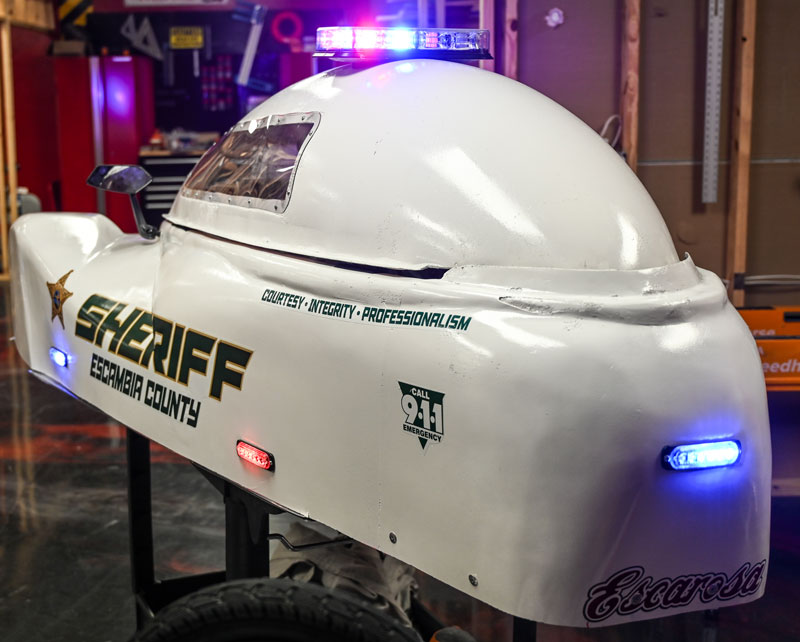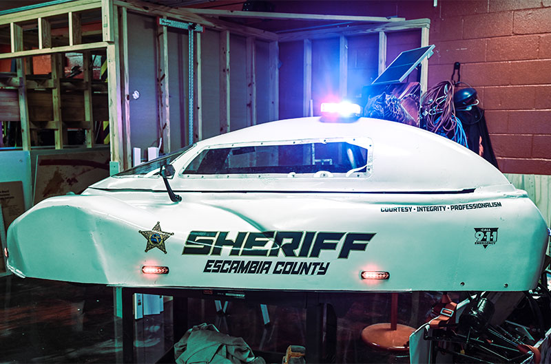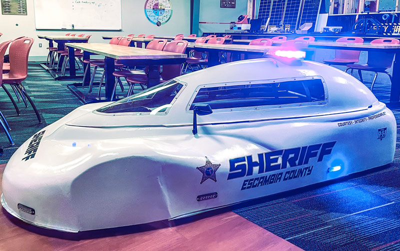 The WFHS Electrathon team’s newest all-electric vehicle is an Escambia County Sheriff’s Office cruiser-themed race car. The car was custom built and designed by the student-members of the team in order to honor the Escambia County Sheriff’s Office. The Sheriff’s Office has played a key role in shaping the Electrathon program and it has become a strong community partner with West Florida High School.