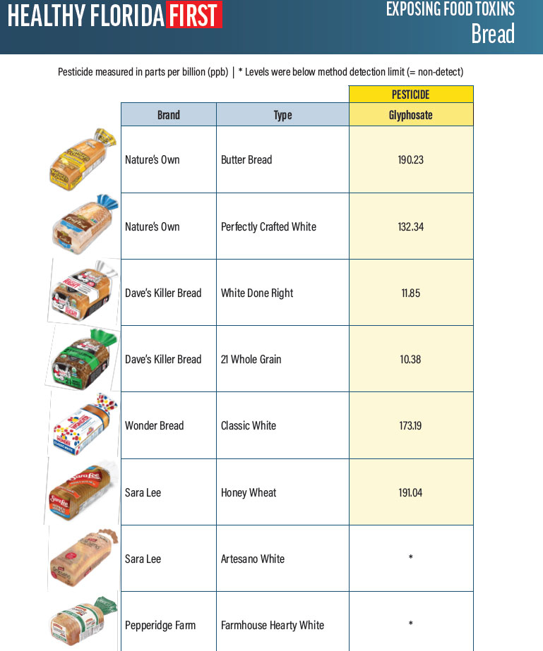 The Florida Department of Health found glyphosate in six of eight bread products tested: Nature’s Own Butter Bread, Nature’s Own Perfectly Crafted White, Dave’s Killer Bread White Done Right, Wonder Bread Classic White, Sara Lee Honey Wheat, and Dave’s Killer Bread 21 Whole Grain, the state said. Results are in the graphic above.