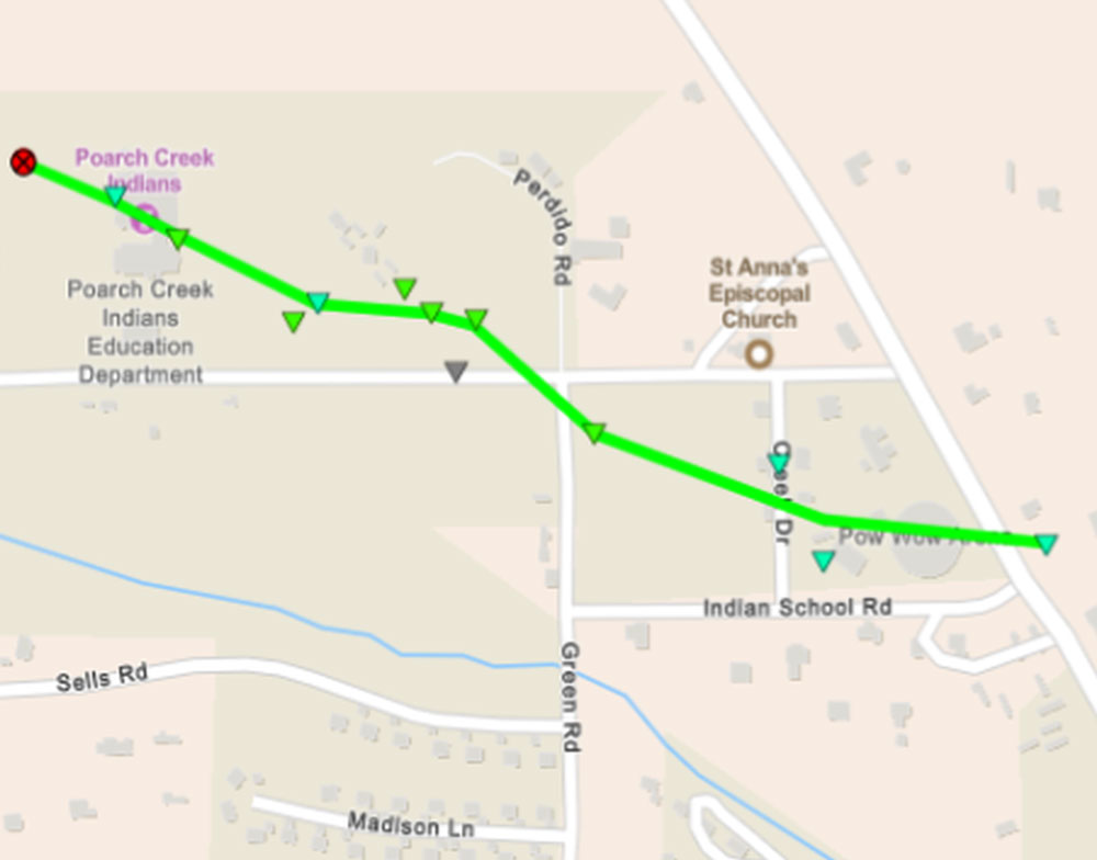 After crossing Lynn McGhee Drive and Green Road, a softwood tree was snapped mid-trunk with large amounts of small tree debris and limbs scattered across the adjacent field.