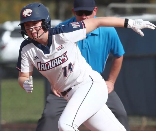 In a 7-0 win, Wine lined a bases-loaded, two-run single up the middle in the top of the first inning. Behind the plate, she helped the Jaguar pitching staff secure its conference-leading eighth shutout of the season. In Sunday’s 5-4 victory, Wine’s sixth-inning home run provided insurance and proved to be the game-winning run.