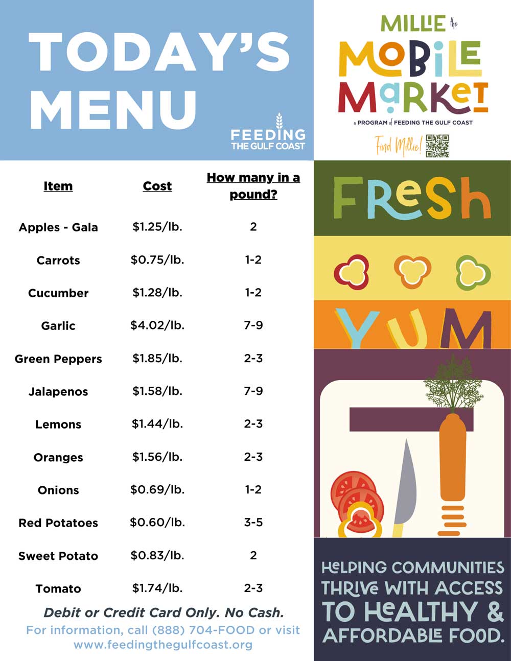 Millie travels routes throughout Feeding the Gulf Coast’s Florida service area, addressing pockets of low food access (food deserts) where supermarkets are scarce, to provide community members the opportunity to buy affordable fresh produce and other nutritious foods at a significantly discounted rate. Feeding the Gulf Coast collaborates with local farmers to purchase produce when available specifically for the Millie Mobile Market.