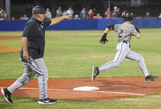 Pictured: Kaiden Posta rounds first base in Tate’s district championship game against the Patriots at Pace. NorthEscambia.com photo, click to enlarge.